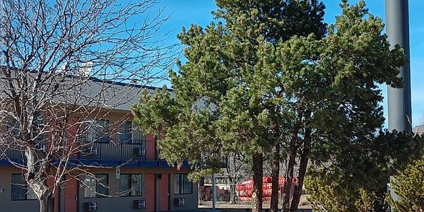 Front of the Building: Peach colored rocks with natural pinon tree. Features a front desk area and small breakfast area for guests. Large tall hotel sign visible from the highway at exit 451 in Raton New Mexico. Situated next to a restaurant and walking distance to a nearby Denny's. Contact Nimi at 719-497-8000.